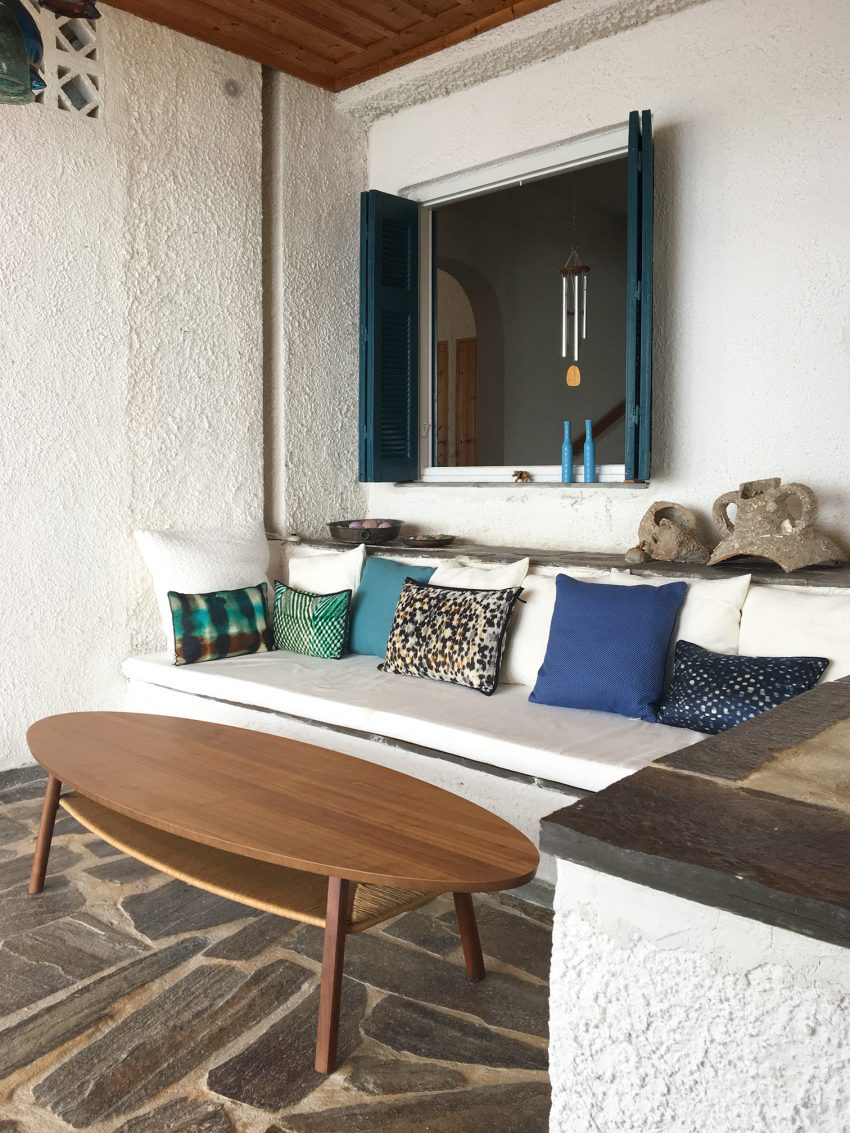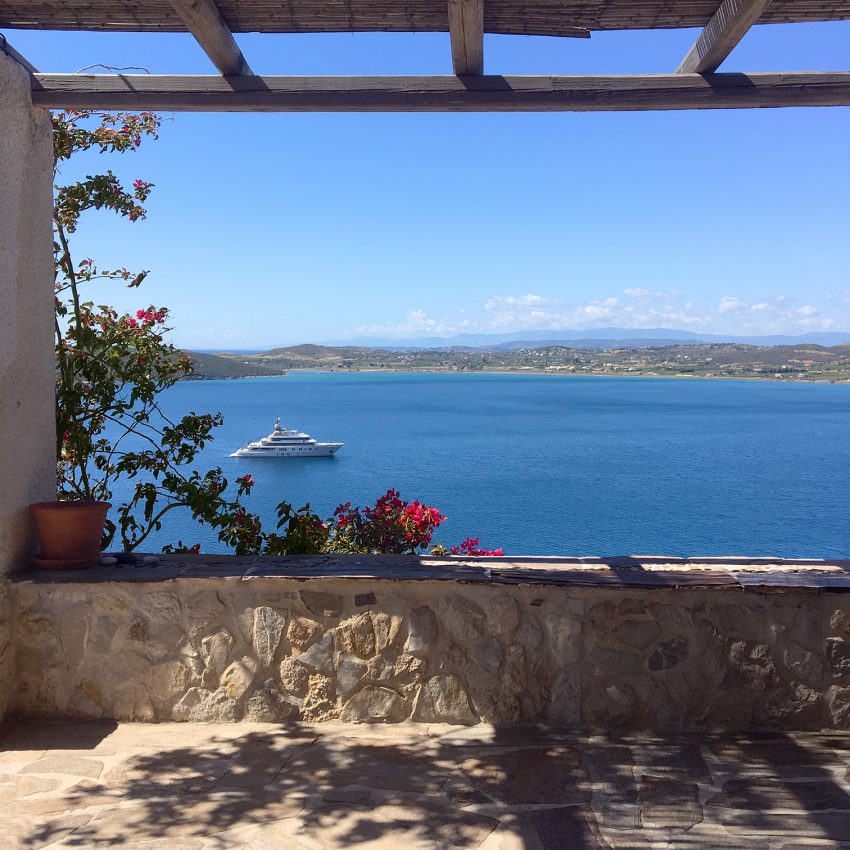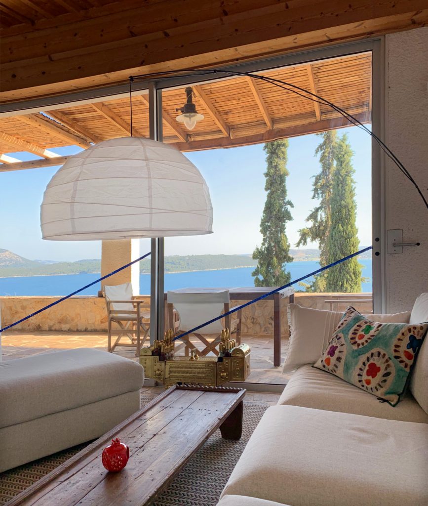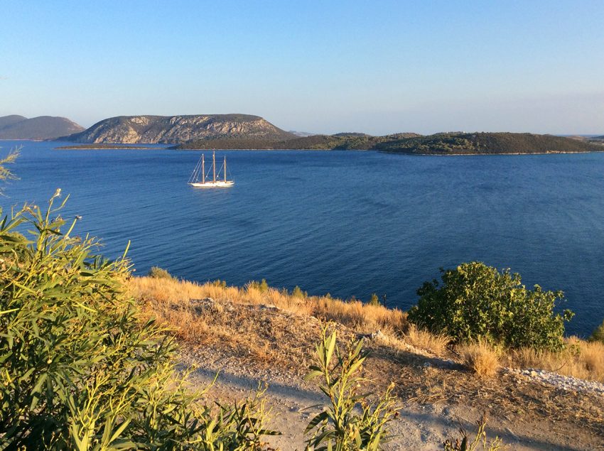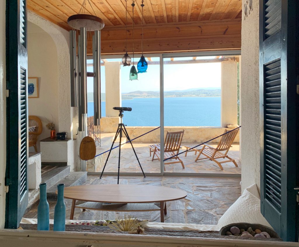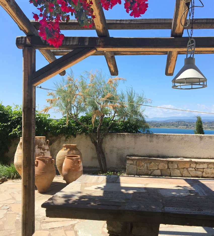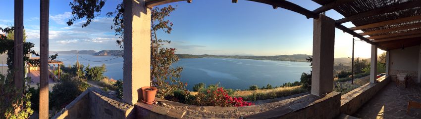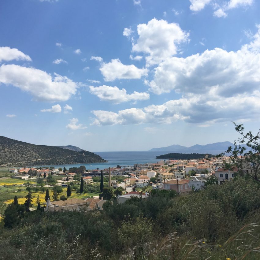 View from the ruins of Thermissia Castle. The arrow points to the Ermioni peninsula, with our house on the hill.