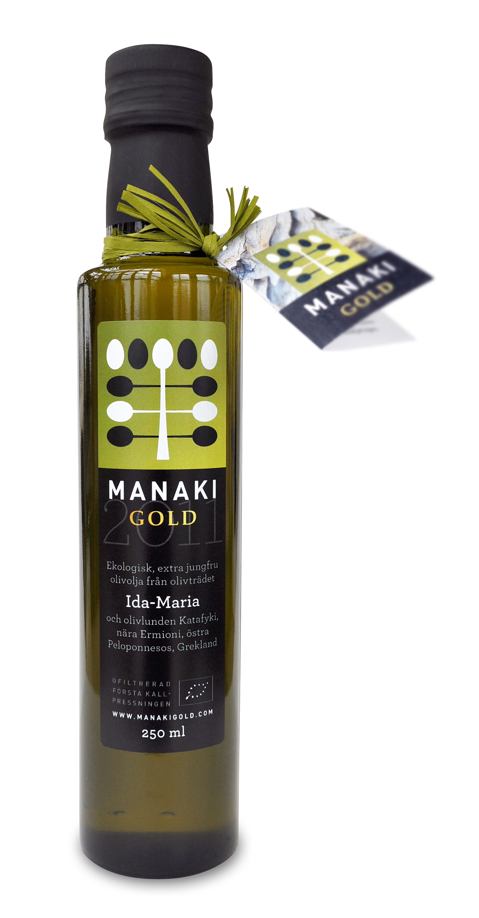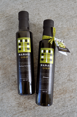 Två 250 ml-flaskor Manaki Gold olivolja årgång 2013,